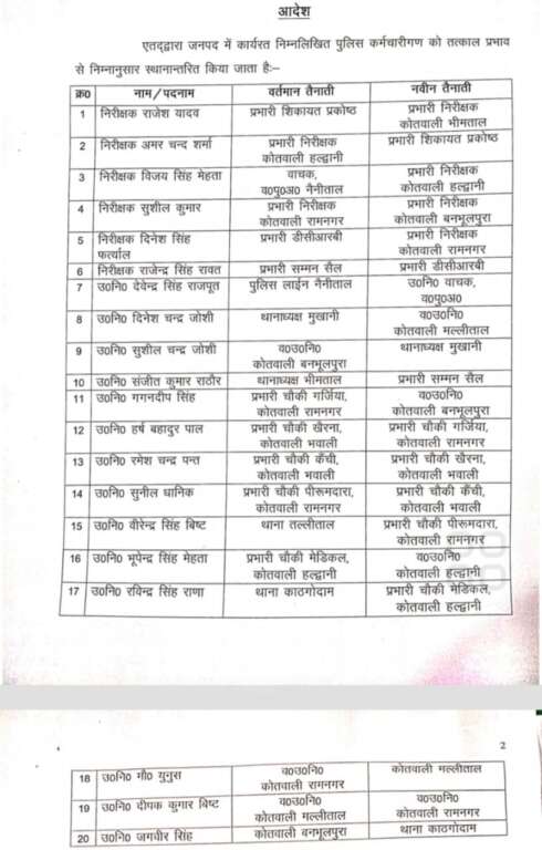 नैनीताल। नैनीताल जिले में पुलिस प्रशासन में बड़ा फेरबदल किया गया है। एसएसपी मंजूनाथ टीसी द्वारा जिले के 6 इंस्पेक्टर और 14 सब इंस्पेक्टरों के प्रभार बदले गए हैं। इस ट्रांसफर लिस्ट में चार कोतवाल और एक थाना इंचार्ज को बदला गया है।