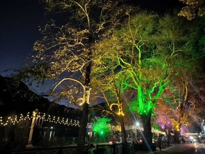 नैनीताल। नववर्ष के स्वागत को लेकर सरोवर नगरी नैनीताल दुल्हन की तरह सज-धज कर तैयार हो गई है। शहर के प्रमुख पर्यटन स्थल माल रोड, तल्लीताल और मल्लीताल क्षेत्र रंग-बिरंगी आकर्षक लाइटों से जगमगा उठे हैं। नैनी झील के किनारे की गई विशेष सजावटी रोशनी शहर की खूबसूरती में चार चांद लगा रही है।