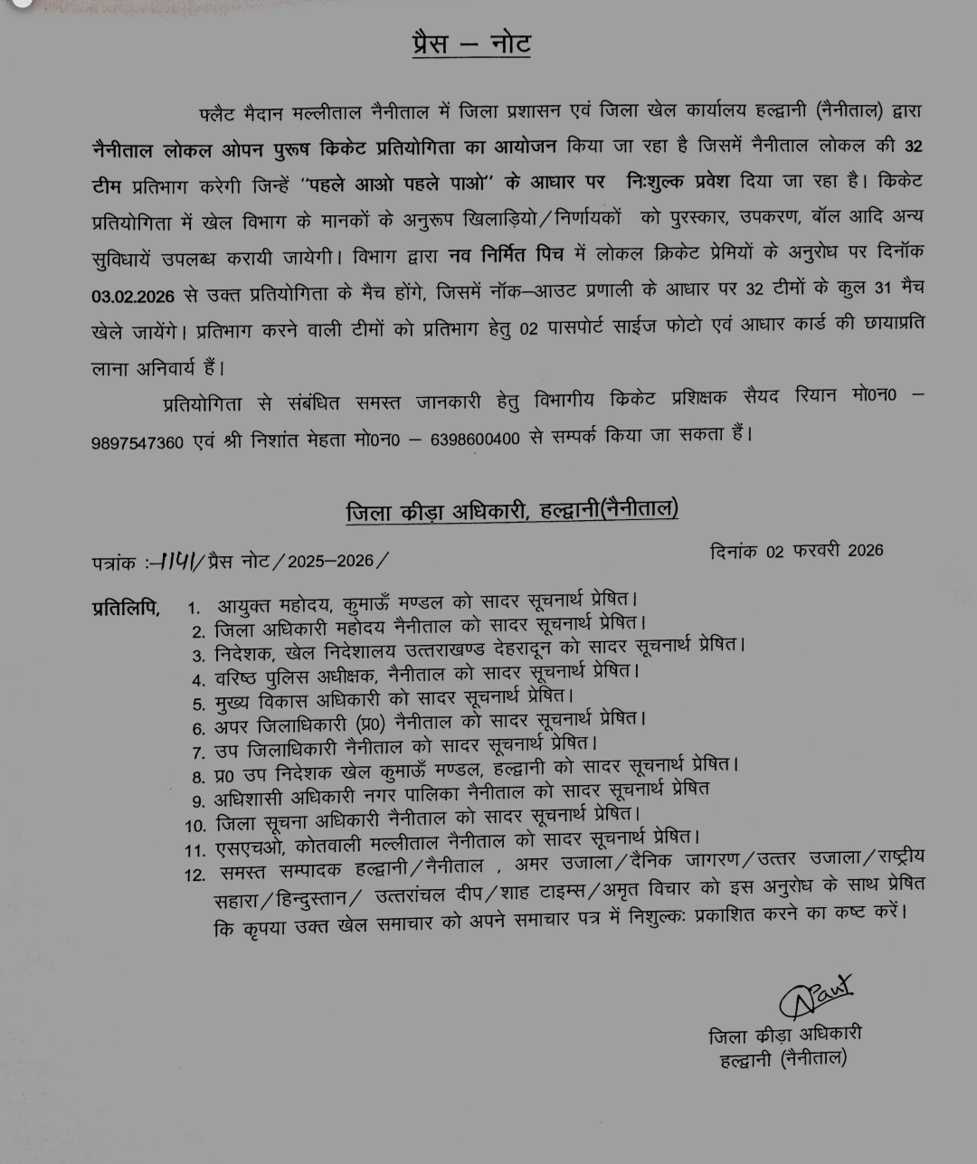 प्रतियोगिता संबंधी जानकारी के लिए विभागीय क्रिकेट प्रशिक्षक सैयद रियान (6398600400, 9897547360) व निशांत मेहता से संपर्क किया जा सकता है।