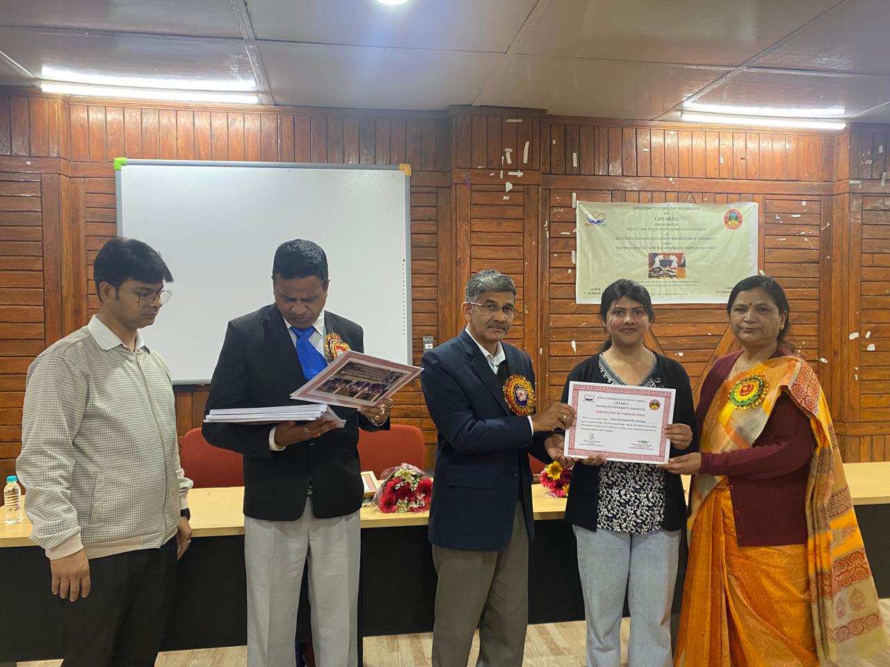 नैनीताल। कुमाऊँ विश्वविद्यालय के डीएसबी परिसर में आयोजित लाइफ कौशल कार्यशाला के द्वितीय दिवस पर ‘आंतरिक शांति और खुशी’ विषय पर एक विशेष सत्र का आयोजन किया गया। कार्यक्रम के दौरान कुलसचिव डॉ. मंगल सिंह मंद्रवाल ने प्रतिभागी विद्यार्थियों को प्रमाण पत्र वितरित किए।