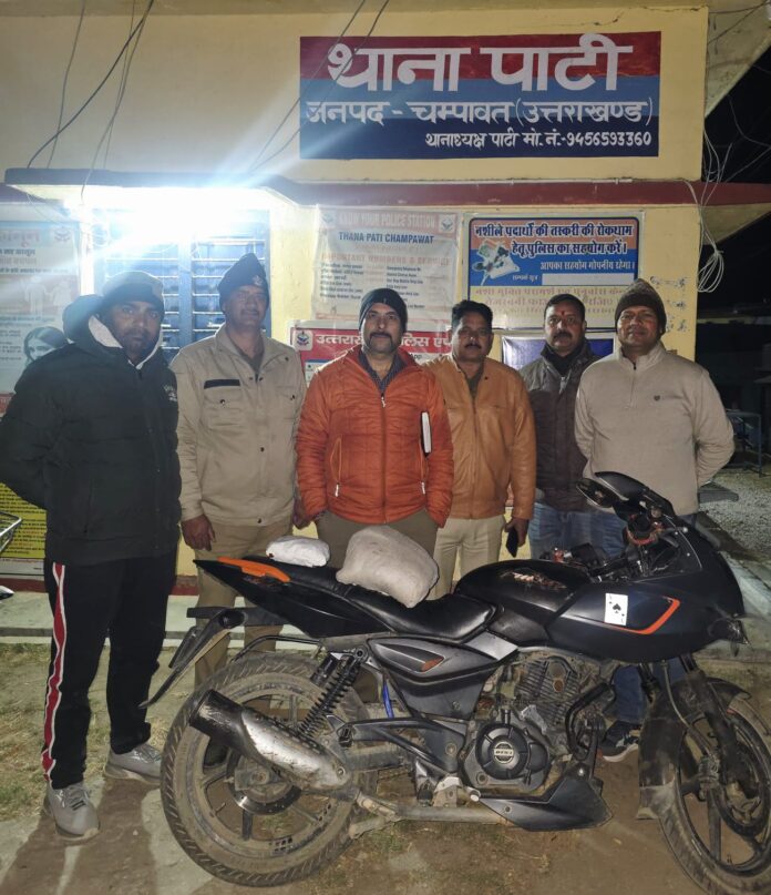 जनपद में नशे के खिलाफ चलाए जा रहे अभियान के तहत चम्पावत पुलिस को बड़ी सफलता मिली है। पुलिस अधीक्षक अजय गणपति के निर्देश पर एसओजी व थाना पाटी पुलिस की संयुक्त टीम ने 802 ग्राम अवैध चरस बरामद की है, जिसकी अनुमानित कीमत करीब 01 लाख रुपये बताई जा रही है। जानकारी के अनुसार 21 जनवरी 2026 को क्षेत्राधिकारी शिवराज सिंह के निर्देशन में गरसाड़ी से आगे गर्शलेख प्राइमरी स्कूल के पास चेकिंग के दौरान संदिग्ध मोटरसाइकिल HR 72 E 3303 को रोका गया। पुलिस को देखकर वाहन चालक मोटरसाइकिल छोड़कर मौके से फरार हो गया। मौके पर मिली उसकी जैकेट की तलाशी लेने पर एक पीले थैले में 802 ग्राम अवैध चरस बरामद हुई।