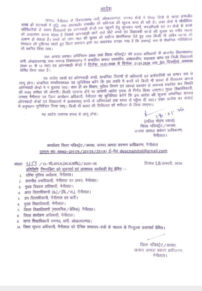 विकासखंड ओखलकांडा, धारी एवं रामगढ़ में बाघ की बढ़ती सक्रियता और क्षेत्र की गंभीर समस्याओं को देखते हुए प्रशासन द्वारा जनहित में एक संवेदनशील निर्णय लिया गया है। बच्चों की सुरक्षा को प्राथमिकता देते हुए क्षेत्र के विद्यालयों में तीन दिनों का अवकाश घोषित किया गया है।