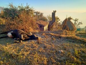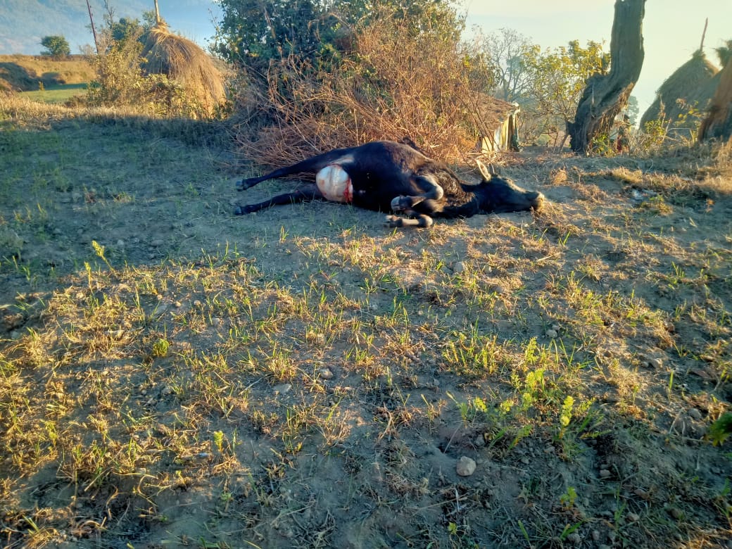 ओखलकांडा क्षेत्र के ढोलीगांव स्थित वन पंचायत पजैना में आबादी के बीच गुलदार (बाघ) द्वारा छोड़ी हुई एक गाय को शिकार बनाए जाने से गांव में दहशत का माहौल बन गया है। बताया जा रहा है कि यह गाय बीते लगभग दो महीनों से पजैना गांव में इधर-उधर घूम रही थी। रात में आबादी क्षेत्र के समीप गुलदार ने गाय पर हमला कर उसे अपना निवाला बना लिया।