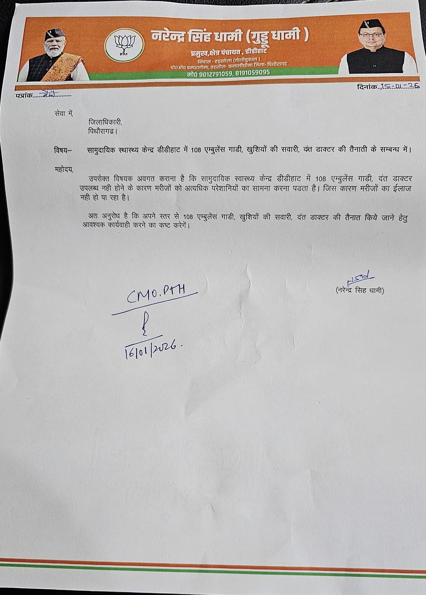 सामुदायिक स्वास्थ्य केंद्र डीडीहाट में स्वास्थ्य सुविधाओं की गंभीर कमी एक बार फिर सामने आई है। क्षेत्र पंचायत सदस्य एवं सामाजिक कार्यकर्ता नरेन्द्र सिंह धामी (गुड्डू धामी) ने जिलाधिकारी पिथौरागढ़ को पत्र भेजकर स्वास्थ्य सेवाओं की दयनीय स्थिति पर चिंता जताई है।