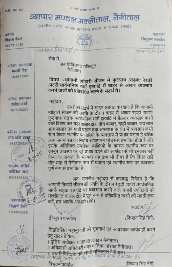 सरोवर नगरी नैनीताल में त्यौहारी सीज़न में बाहर से आकर फुटपाथ,पटरी,रेहड़ी, सार्वजनिक मार्ग व बाजारों में बैठ कर व्यवसाय करने वाले तमाम लोगों को व्यापार मंडल मल्लीताल द्वारा प्रतिबन्धित किये जाने की माँग उपजिलाधिकारी से की है।आपको बता दें कि व्यापार मंडल मल्लीताल के अध्यक्ष किशन सिंह नेगी व महामंत्री त्रिभुवन फ़र्त्याल ने आज उपजिलाधिकारी नवाज़िश ख़ालिक़ को उक्त संदर्भ में एक ज्ञापन सौंपा जिसमें कहा गया कि विगत साढ़े तीन माह से अत्यधिक वर्षा के कारण माहौल आपदाजनक हो गया है।जिससे पर्यटक बिल्कुल नदारत रहा।अब त्यौहारी सीज़न शुरू होने के कारण बाहरी फड़, फुटपाथ व्यापारियों को किसी प्रकार से बड़ा बाजार,मॉल रोड खड़ी बाजार,पिछाड़ी बाजार सहित अन्य क्षेत्रों में प्रवेश प्रतिबंधित किया जाय।