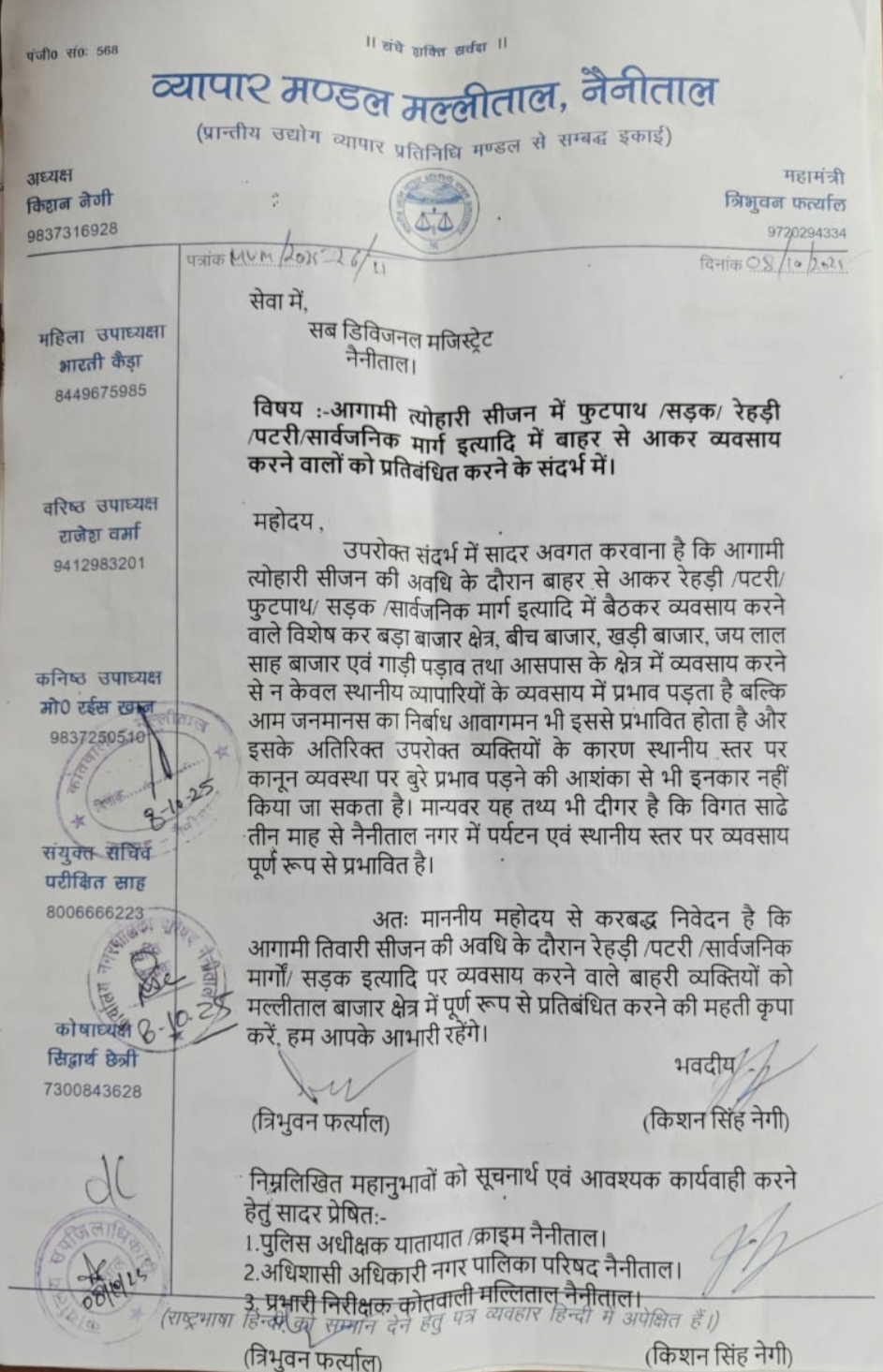 नैनीताल के मल्लीताल व्यापार मंडल अध्यक्ष किसन सिंह नेगी ने स्टार ख़बर को बताया कि विगत साढ़े तीन माह से अत्यधिक बारिश के चलते आपदा जैसे हालात उत्पन्न हो गए हैं और अब जबकि त्यौहारी सीज़न निकट है और स्थानीय बाजारों में बाहरी व्यापारियों का जमघट शुरू हो गया है इसलिए प्रशासन से गुजारिश की गई है कि किसी प्रकार बाहरी अवैध कारोबारियों को बाज़ार क्षेत्रों में प्रवेश प्रतिबंधित किया जाय।व्यापार मंडल मल्लीताल के महामंत्री त्रिभुवन फ़र्त्याल भी सब डिविजनल मजिस्ट्रेट को ज्ञापन देने वाले शिष्ट मंडल में शामिल रहे।उक्त ज्ञापन की प्रतिलिपि पुलिस अधीक्षक यातायात,अधिशासी अधिकारी नगरपालिका परिषद नैनीताल व प्रभारी निरीक्षक कोतवाली मल्लीताल नैनीताल को भी अग्रिम कार्यवाही के लिए प्रेषित की गई है।