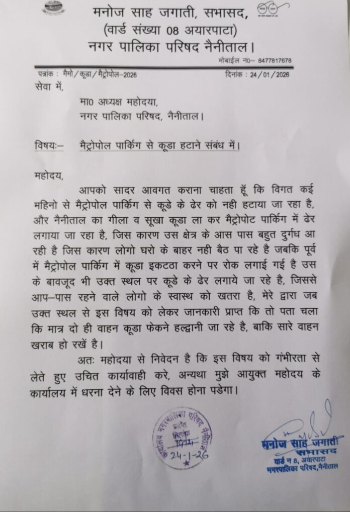नैनीताल नगरपालिका से अयारपाटा वार्ड नं-8 से पार्षद मनोज जगाती ने चेयरमैन सरस्वती खेतवाल से उक्त कचरे के ढेर को जल्द से जल्द हटाने की माँग की है। मनोज साह जगाती ने स्टार ख़बर को बताया कि नगरपालिका की कूड़े को उठाने वाली केवल दो गाड़ियां ही कूड़ा लेकर हल्द्वानी जा रही हैं।बाकी कूड़ा वाहन खराब चल रहे हैं। जिससे मेट्रोपोल पार्किंग स्थल पर बदबू बजबजा रहा है।उन्होंने पालिकाध्यक्ष सरस्वती खेतवाल से निवेदन किया है कि उक्त बदबूदार कूड़े के पहाड़ को हटाया जाय अन्यथा उन्हें कुमाऊँ कमिश्नर दीपक रावत के कार्यालय में धरना देने को बाध्य होना पड़ेगा।